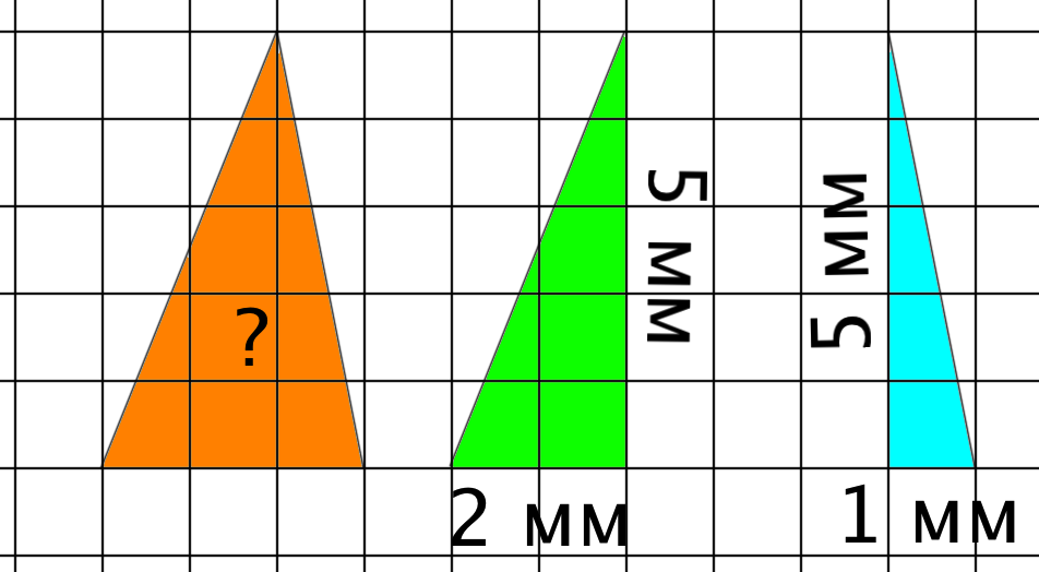 Площадь оранжевого треугольника равна сумме площадей зеленого и голубого треугольников. Найдите площадь оранжевого треугольника, если стороны зеленого треугольника равны \(\displaystyle 2\) мм и \(\displaystyle 5\) мм, а стороны голубого - \(\displaystyle 1\) мм и \(\displaystyle 5\) мм.