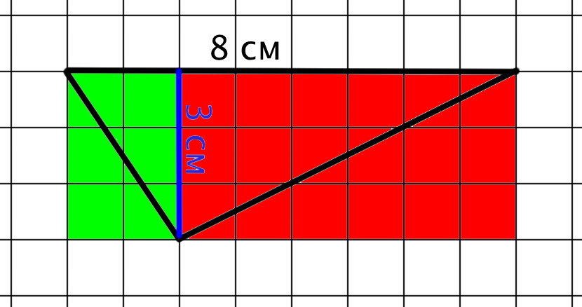 Значит, площадь треугольника равна половине площади прямоугольника, составленного из зеленого и красного прямоугольников. Зеленый и красный прямоугольники образуют один прямоугольник со сторонами \(\displaystyle 8\) см и \(\displaystyle 3\) см.