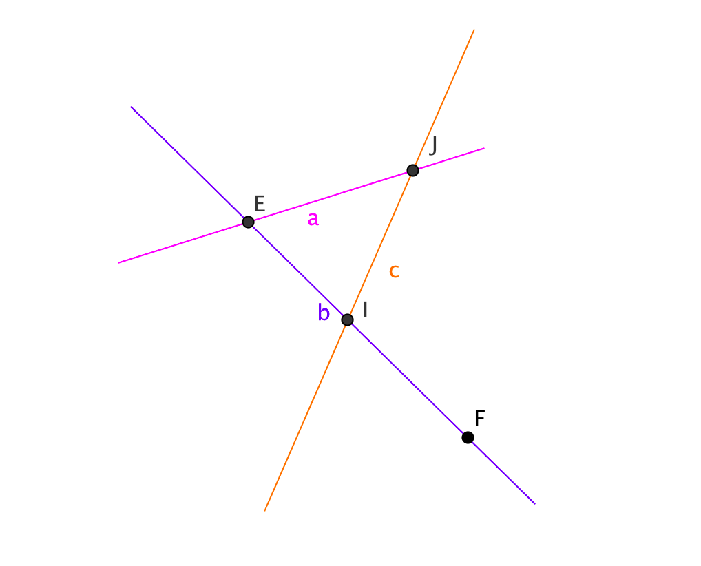 На рисунке изображены три прямые \(\displaystyle a\), \(\displaystyle b\), \(\displaystyle c\), пересекающиеся в точках \(\displaystyle E\), \(\displaystyle I\) и \(\displaystyle J\). Точка \(\displaystyle F\) принадлежит прямой \(\displaystyle b\). Сколько всего отрезков изображено на рисунке?