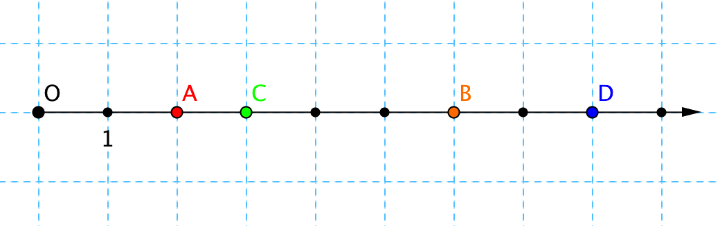 Как видно из рисунка, на расстоянии от точки \(\displaystyle O\), равном \(\displaystyle 2\), то есть на расстоянии \(\displaystyle 2\)-х единичных отрезков, находится точка \(\displaystyle A\).