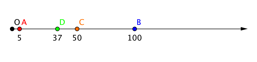 Изобразим на координатном луче точки \(\displaystyle A(5)\), \(\displaystyle B(100)\), \(\displaystyle C(56)\) и \(\displaystyle D(37)\). Координаты точек слишком велики для того чтобы показать на рисунке единичный отрезок – он будет слишком мал, поэтому его показывать не будем.