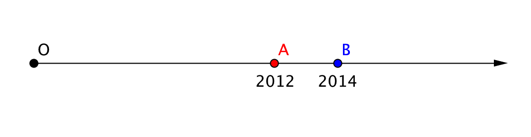 Таким образом, расстояние между точками \(\displaystyle A(2012)\) и \(\displaystyle B(2014)\) равно длине отрезка \(\displaystyle AB\), или разности координат его правого и левого концов, – то есть соответственно координат точек \(\displaystyle A(2012)\) и \(\displaystyle B(2014)\):