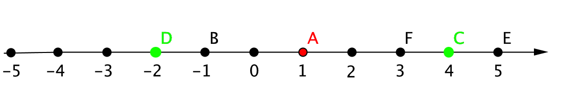 Если отложить от точки \(\displaystyle A(1)\) влево \(\displaystyle 3\) единичных отрезка, то мы получим точку с координатой \(\displaystyle 1-3=-2\). Это точка \(\displaystyle D(-2)\).