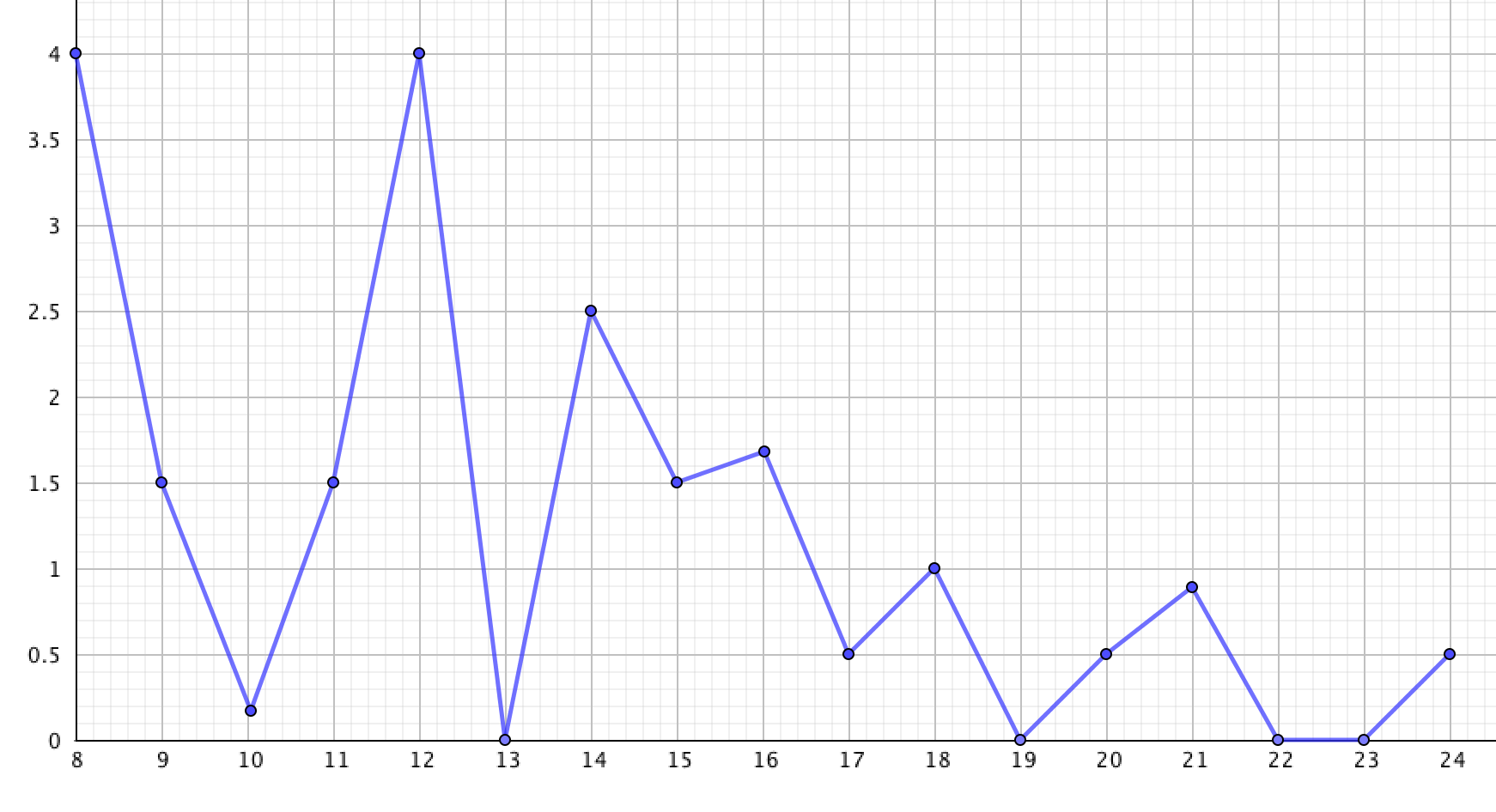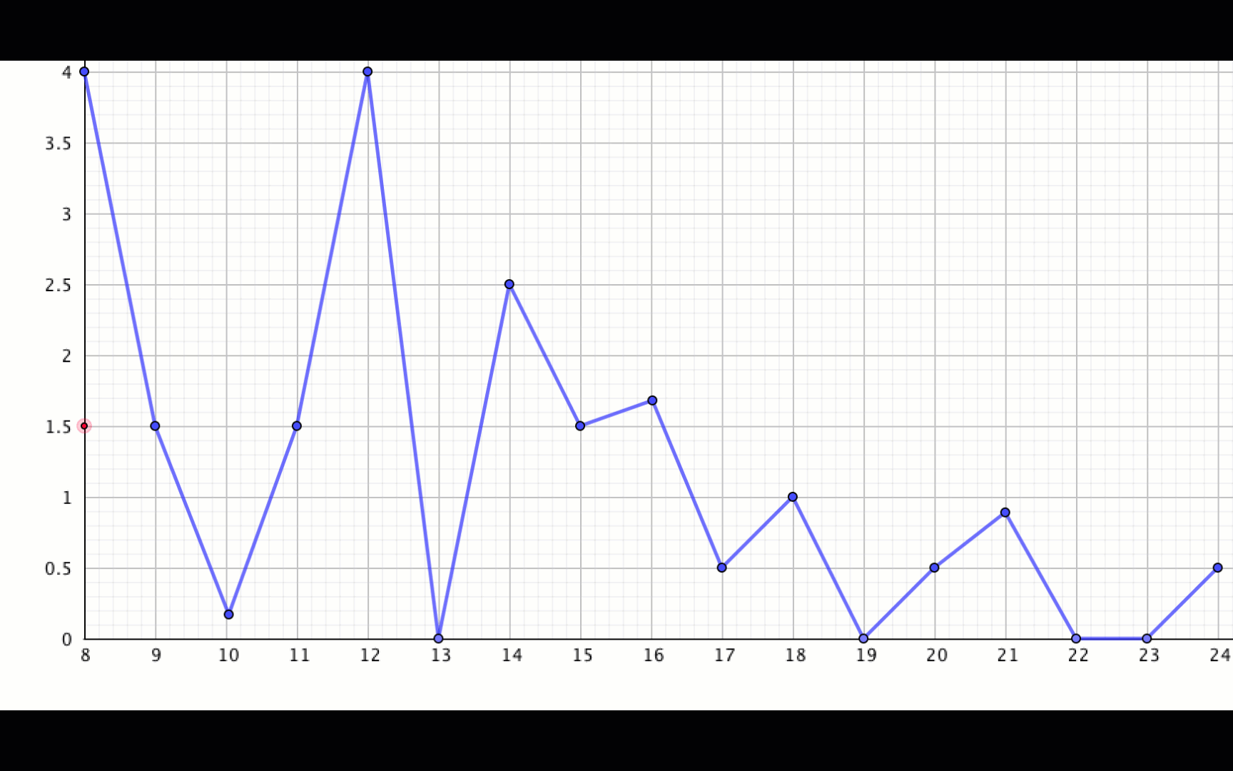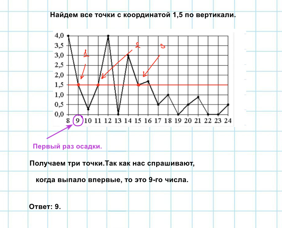 На рисунке жирными точками показано суточное количество осадков, выпадавших в Актау с \(\displaystyle 8\) по \(\displaystyle 24\) января \(\displaystyle 2005\) года. По горизонтали указываются числа месяца, по вертикали количество осадков, выпавших в соответствующий день, в миллиметрах. Для наглядности жирные точки на рисунке соединены линией. Определите по рисунку, какого числа в Актау впервые выпало ровно \(\displaystyle 1{,}5\) миллиметра осадков.