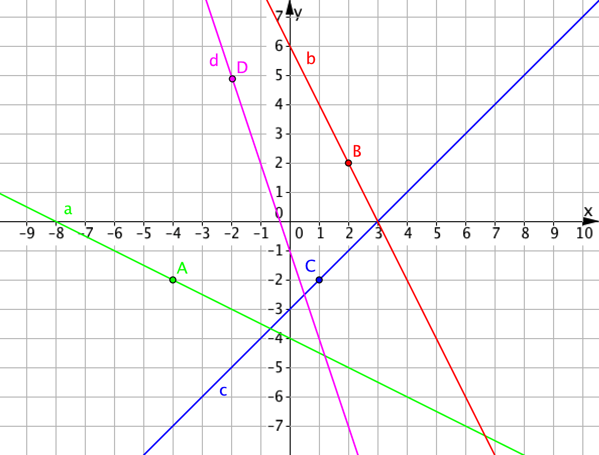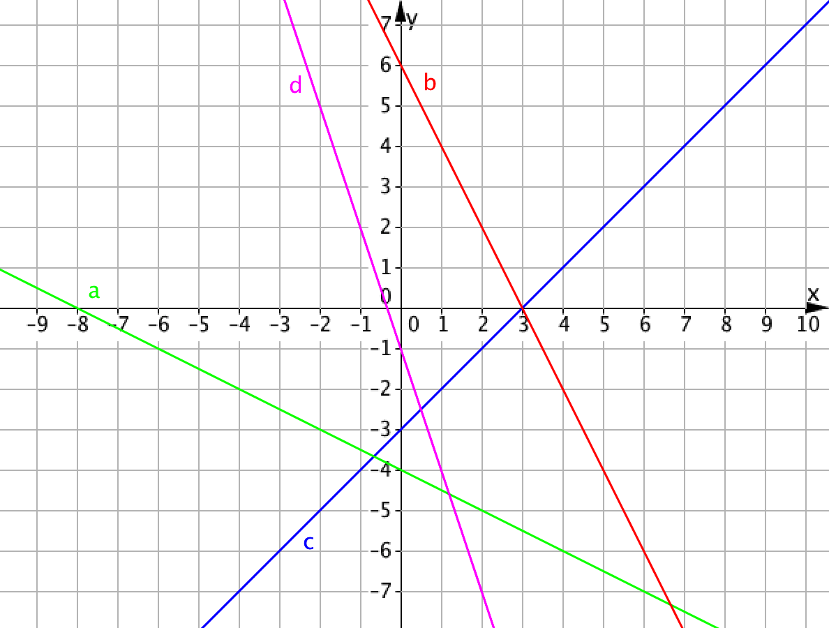 На рисунке изображены четыре прямые: \(\displaystyle a{\small ,}\) \(\displaystyle b{\small ,}\) \(\displaystyle c\) и \(\displaystyle d{\small .}\) Какая из них является графиком линейной функции \(\displaystyle y=-2x+6{\small ? }\)