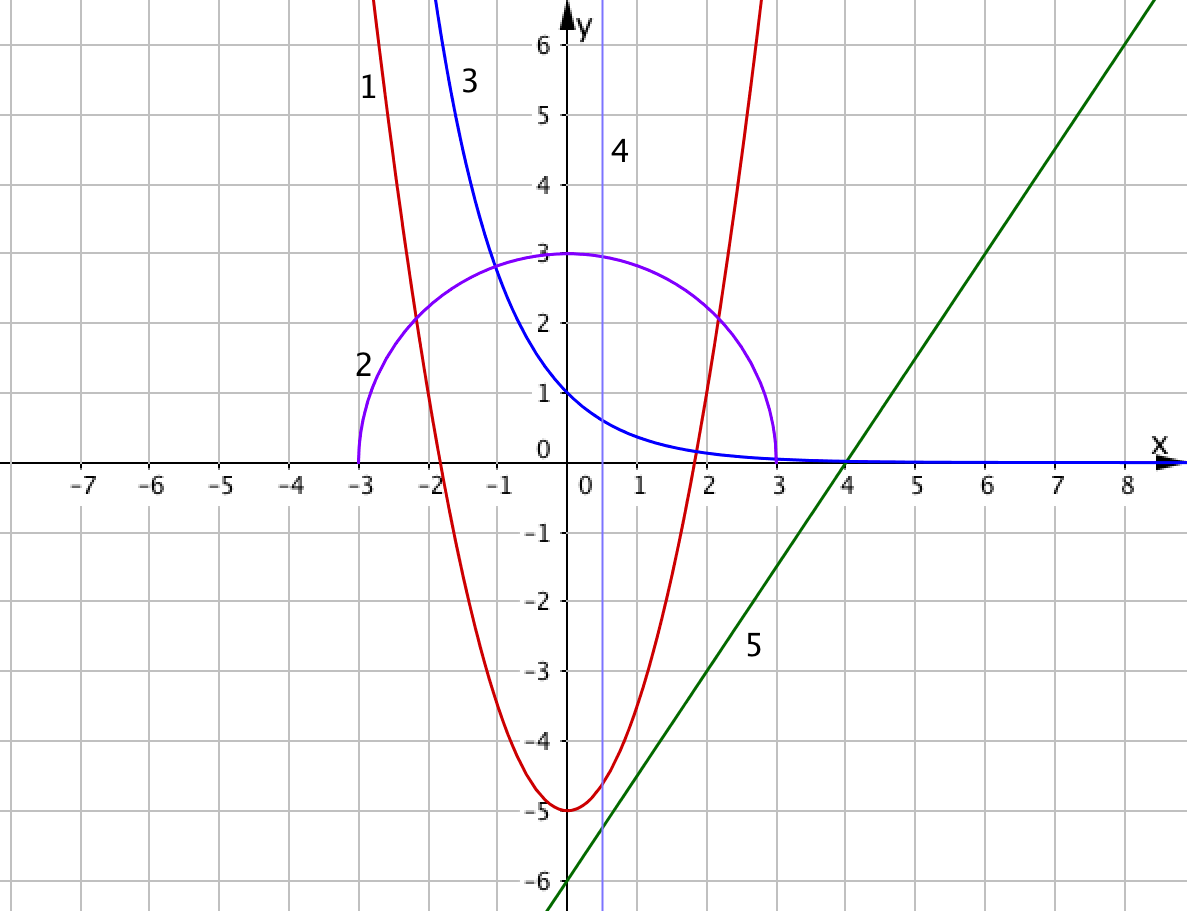 На рисунке изображены графики пяти функций. Из них только два изображают прямые – это графики под номерами \(\displaystyle 4 \) и \(\displaystyle 5{\small . } \) Следовательно, графики с номерами \(\displaystyle 1{\small ,} \, 2 \) и \(\displaystyle 3 \) не являются графиками линейной функции.