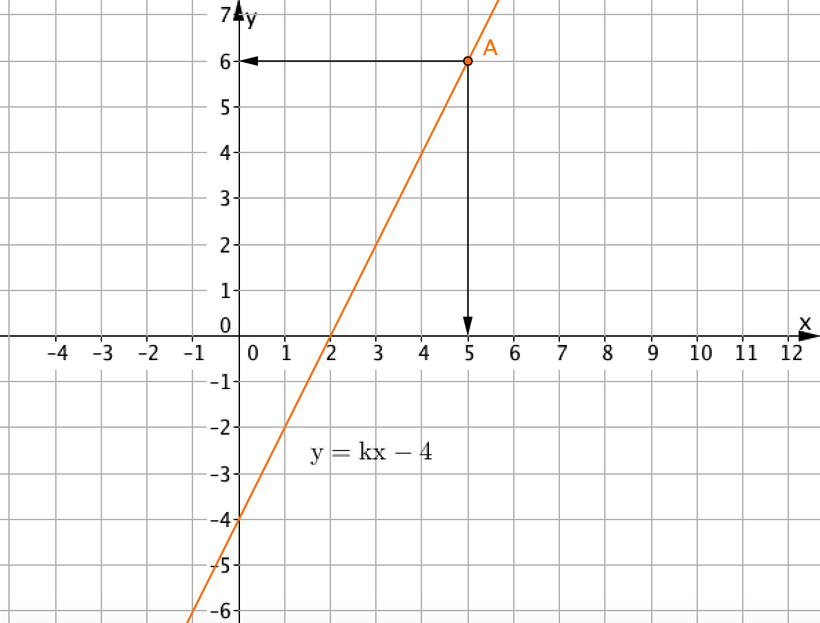Подставим координаты точки \(\displaystyle A(\color{blue}{5};\, \color{green}{6})\) в уравнение прямой \(\displaystyle y=kx-4\,{\small :}\)