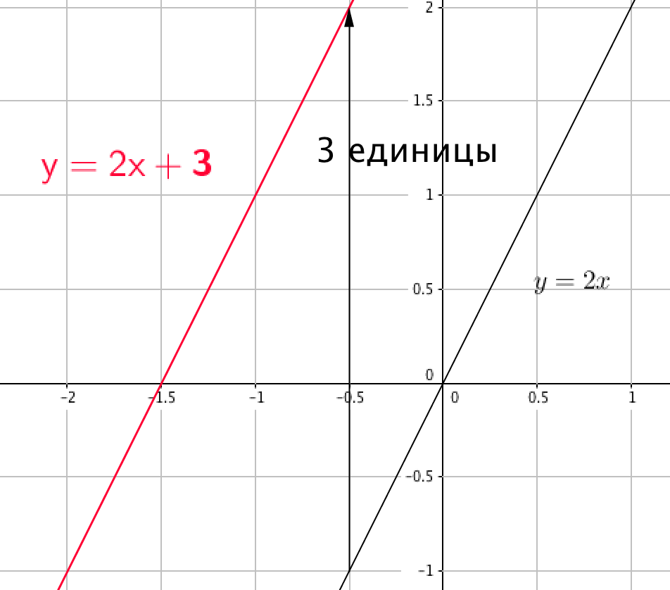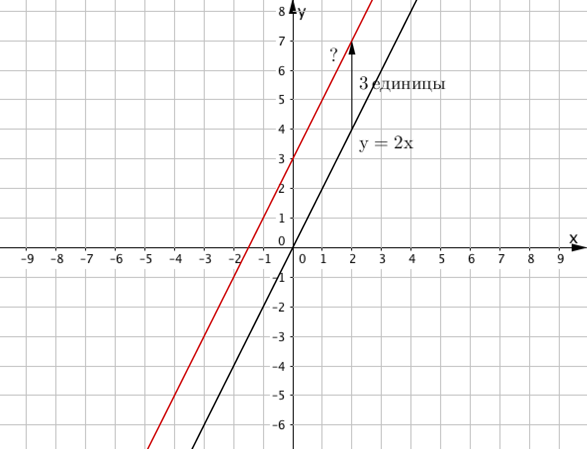 Нам дан график функции \(\displaystyle y=2x{\small . } \) Мы его поднимаем на \(\displaystyle \color{blue}{ 3}\) единицы вверх.