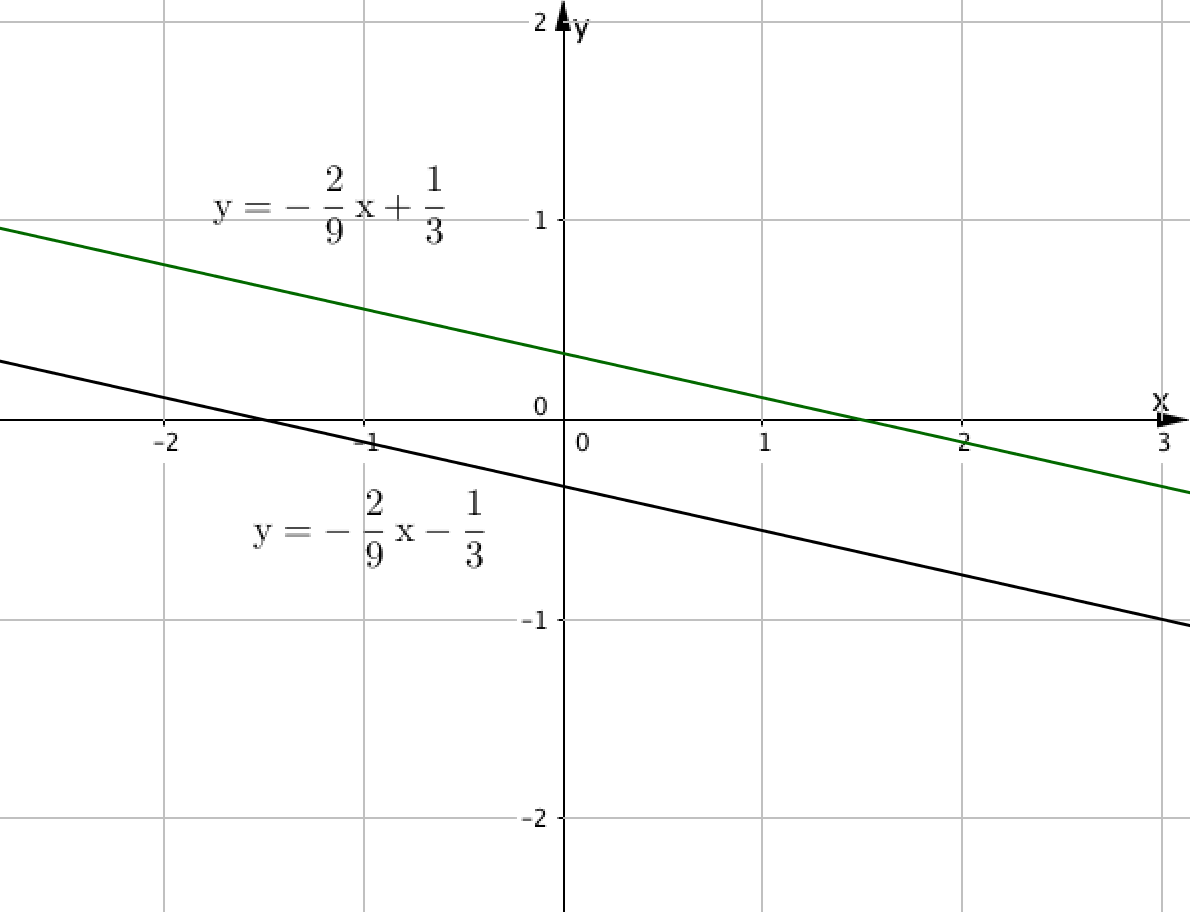 Согласно правилу, это означает, что прямая \(\displaystyle y=-\frac{2}{9}x+\frac{1}{3}\) получена из прямой \(\displaystyle y=-\frac{2}{9}x-\frac{1}{3}\) сдвигом на \(\displaystyle \bf \frac{2}{3}\) единиц вверх.