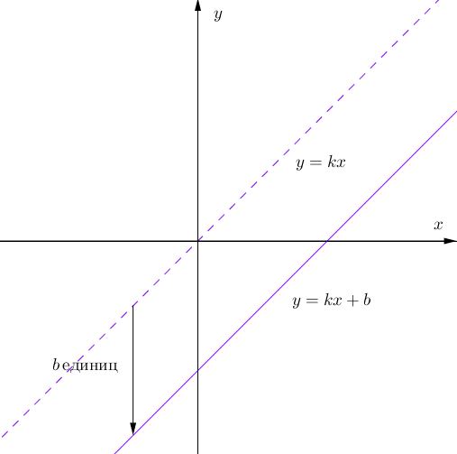 Если отбросить коэффициент \(\displaystyle b{\small ,}\) то получится прямая \(\displaystyle y=kx{\small , } \) параллельная исходной прямой \(\displaystyle y=kx+b \) и проходящая через начало координат. Другими словами, прямая \(\displaystyle y=kx+b \) получена из прямой \(\displaystyle y=kx \) сдвигом на \(\displaystyle b \) единиц вниз: