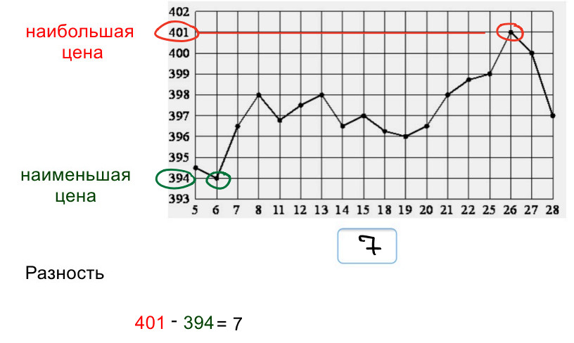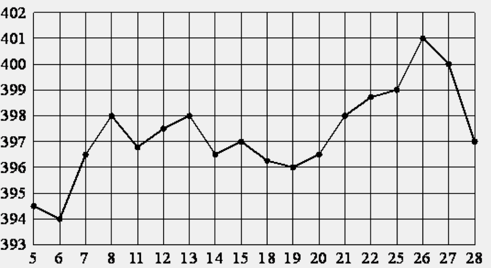 На рисунке жирными точками показана цена унции золота на момент закрытия биржевых торгов во все рабочие дни с \(\displaystyle 5\) по \(\displaystyle 28\) марта \(\displaystyle 1996\) года. По горизонтали указываются числа месяца, по вертикали цена унции золота в долларах США. Для наглядности жирные точки на рисунке соединены линией. Определите по рисунку разность между наибольшей и наименьшей ценой золота на момент закрытия торгов в указанный период (в долларах США за унцию).