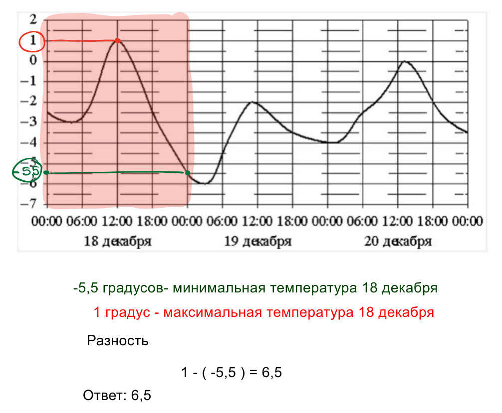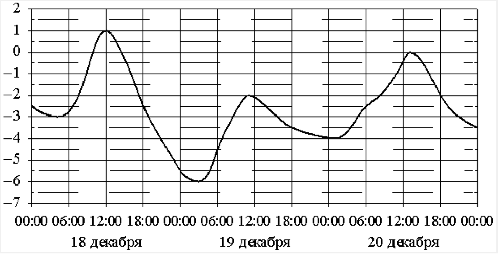 На рисунке показано изменение температуры воздуха на протяжении трёх суток. По горизонтали указывается дата и время, по вертикали значение температуры в градусах Цельсия. Определите по рисунку разность между наибольшей и наименьшей температурами воздуха \(\displaystyle 18\) декабря. Ответ дайте в градусах Цельсия.