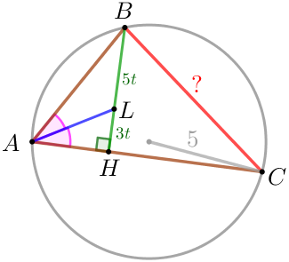 По условию \(\displaystyle \frac{BL}{LH}=\frac{5}{3} {\small,}\) \(\displaystyle R=5 \) – радиус окружности, описанной около треугольника \(\displaystyle ABC{\small.}\) Требуется найти длину стороны \(\displaystyle BC {\small.}\) |