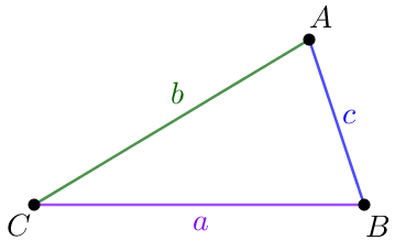 \(\displaystyle \frac{\color{Purple}{a}}{\sin(\angle A)}=\frac{\color{green}{b}}{\sin(\angle B)}=\frac{\color{blue}{c}}{\cos(\angle C)}=2\color{red}{R}{\small,}\) где \(\displaystyle \color{red}{R}\) – радиус описанной окружности. |
