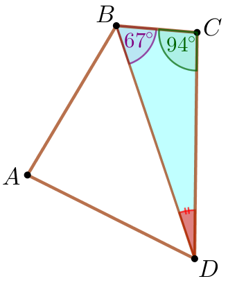\(\displaystyle б)\) По условию задачи \(\displaystyle \angle CBD=67^{\circ}{\small,}\) \(\displaystyle \angle BCD=94^{\circ}{\small.}\)