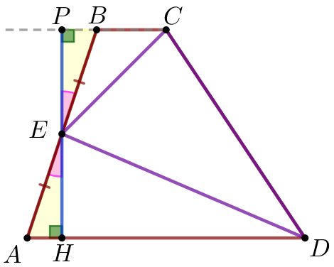 ![]() | Через точку \(\displaystyle E\) построим перпендикуляр к основаниям трапеции. Обозначим буквами \(\displaystyle P\) и \(\displaystyle H\) точки пересечения перпендикуляра с прямыми \(\displaystyle BC\) и \(\displaystyle AD\) соответственно. Рассмотрим прямоугольные треугольники \(\displaystyle BEP\) и \(\displaystyle AEH{\small:}\)