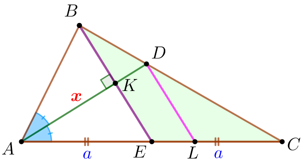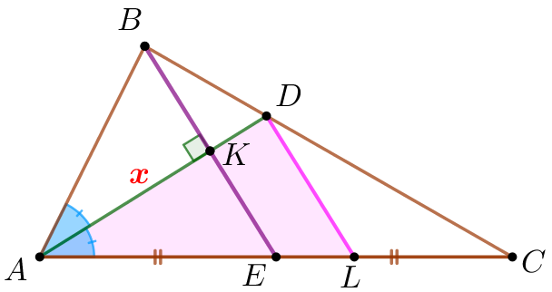 ![]() | Построим отрезок \(\displaystyle DL\) параллельно медиане \(\displaystyle BE{\small.}\) |