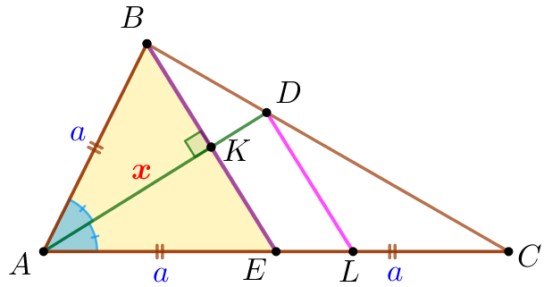 Так как биссектриса \(\displaystyle AK\) является и высотой треугольника \(\displaystyle ABE {\small,}\) то \(\displaystyle \triangle ABE \) – равнобедренный.