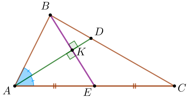 В треугольнике \(\displaystyle ABC\) биссектриса \(\displaystyle BE\) и медиана \(\displaystyle AD\) перпендикулярны и пересекаются в точке \(\displaystyle K{\small.}\) Найдите длину отрезка \(\displaystyle AK{\small,}\) если \(\displaystyle AD=12{\small.}\)