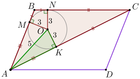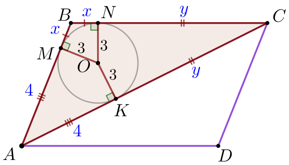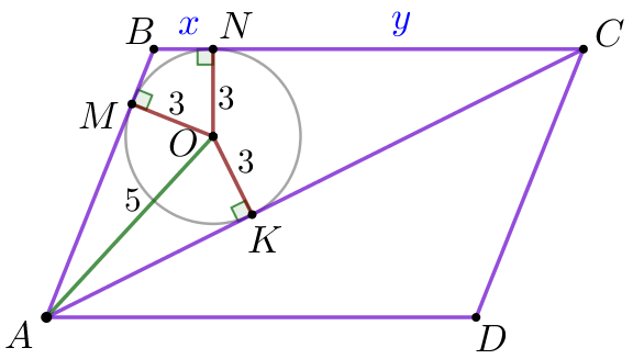 Обозначим буквами \(\displaystyle M\) и \(\displaystyle N\) – точки касания окружности со сторонами \(\displaystyle AB\) и \(\displaystyle BC\) соответственно. Отрезки \(\displaystyle OM {\small,}\) \(\displaystyle ON\) и \(\displaystyle OK\) равны как радиусы вписанной окружности. То есть \(\displaystyle OM=ON=OK=3 {\small.}\) Пусть \(\displaystyle BN=x {\small,}\) \(\displaystyle CN=y {\small.}\) Тогда \(\displaystyle BC=x+y{\small.}\) | ![]() |