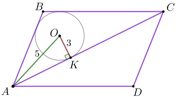 В параллелограмме \(\displaystyle ABCD\) проведена диагональ \(\displaystyle AC {\small.}\) Точка \(\displaystyle O\) является центром окружности, вписанной в треугольник \(\displaystyle ABC {\small.}\) Расстояние от точки \(\displaystyle O\) до точки \(\displaystyle A\) и прямой \(\displaystyle AC\) соответственно равны \(\displaystyle 5\) и \(\displaystyle 3{\small.}\) Найдите длину стороны \(\displaystyle BC{\small,}\) если площадь параллелограмма \(\displaystyle ABCD \) равна \(\displaystyle 168{\small.}\)