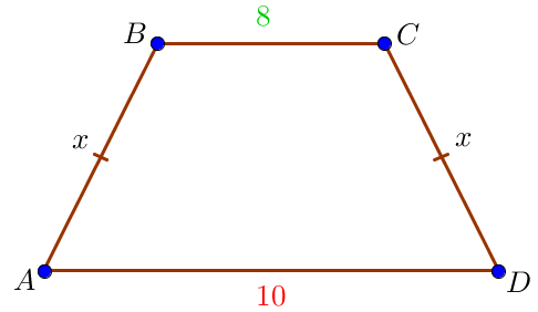 Пусть \(\displaystyle AB=CD=x\) – боковые стороны, \(\displaystyle \color{green}{BC}=\color{green}{8}\) и \(\displaystyle \color{red}{AD}=\color{red}{10}\) – основания равнобедренной трапеции. Периметр \(\displaystyle \color{blue}{P}\) многоугольника равен сумме длин всех его сторон. Тогда \(\displaystyle \color{blue}{P}=AB+\color{green}{BC}+CD+\color{red}{AD}\small.\)