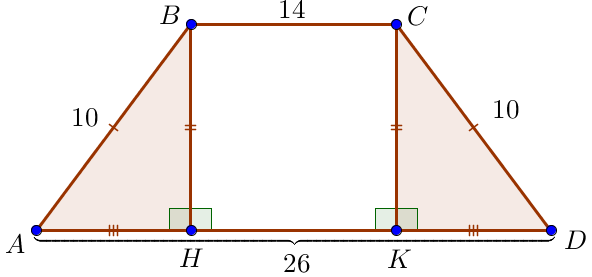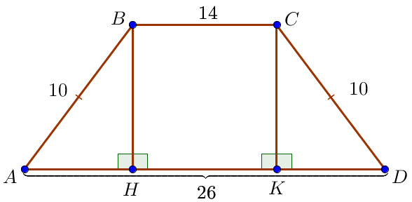 Прямоугольные треугольники \(\displaystyle ABH\) и \(\displaystyle DCK\) равны по гипотенузе \(\displaystyle AB=CD\ \\ \) и катету \(\displaystyle BH=CK\small.\) Значит \(\displaystyle AH=DK\) и \(\displaystyle \begin{aligned} AH&=DK=\frac{AD-BC}{2}=\\ \\ &=\frac{26-14}{2}=\frac{12}{2}=6\small. \end{aligned}\) | ![]() |