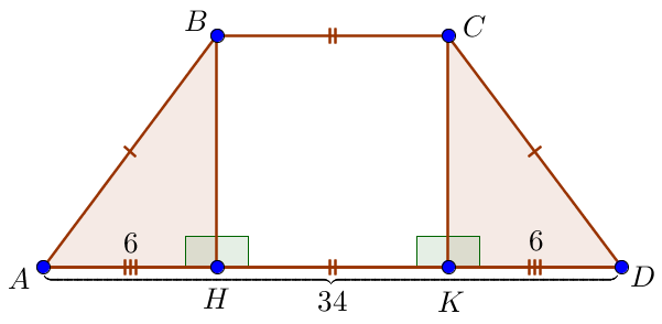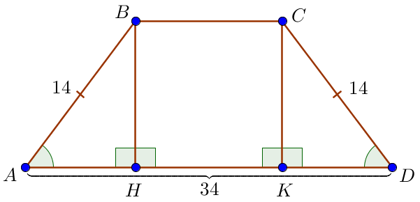 Пусть \(\displaystyle AD=34\) – большее основание, \(\displaystyle AB=CD=14\) – боковые стороны равнобедренной трапеции \(\displaystyle ABCD\small.\)