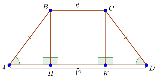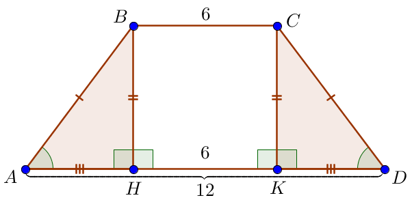Прямоугольные треугольники \(\displaystyle ABH\)и \(\displaystyle DCK\) равны по гипотенузе \(\displaystyle AB=CD\) и катету \(\displaystyle BH=CK\small.\) Значит, \(\displaystyle AH=DK\) и \(\displaystyle AH=DK=\frac{AD-BC}{2}\small,\) \(\displaystyle AH=\frac{12-6}{2}=\frac{6}{2}=3\small.\) | ![]() |