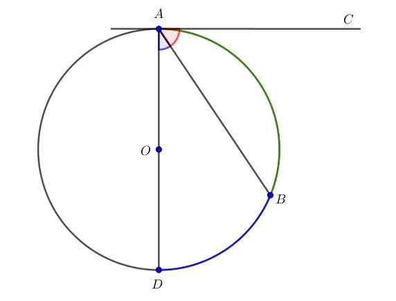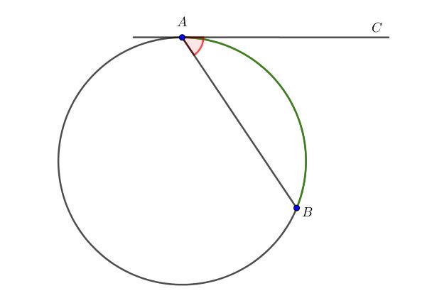 Изучение связи между углом \(\displaystyle \angle BAC\) и дугой \(\displaystyle AB \) позволяет получить следующую формулу для величины угла между касательной и хордой: