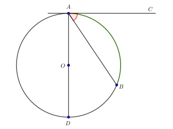 Величина угла между касательной и хордой, проходящей через точку касания, равна половине угловой меры заключенной между ними дуги.