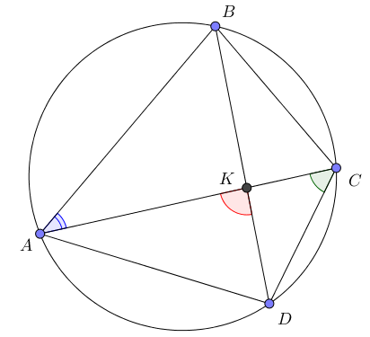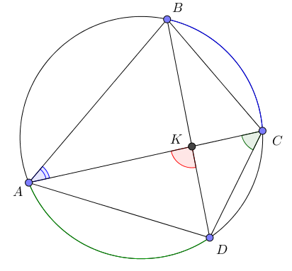 \(\displaystyle \angle AKD=\frac{1}{2} \overset{\smile}{AD}+\frac{1}{2} \overset{\smile}{CB}=50^{\circ}+35^{\circ}=85^{\circ} \small.\)