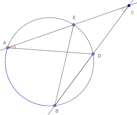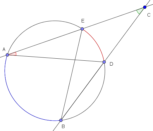 \(\displaystyle \angle ACB=\frac{1}{2} \overset{\smile}{AB}-\frac{1}{2} \overset{\smile}{DE} \small.\)