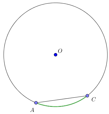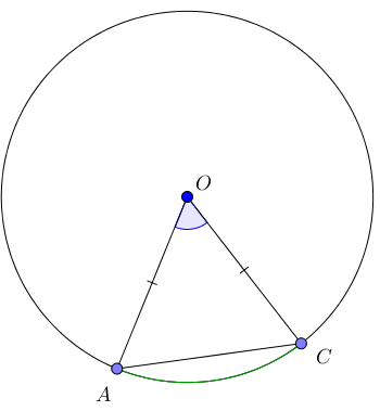 Пусть \(\displaystyle O\) – центр окружности, \(\displaystyle OA=OC\) – ее радиусы, \(\displaystyle AC=3 \small, \) \(\displaystyle \overset{\smile}{AC}=60^\circ \small.\)
