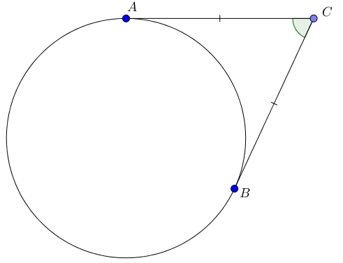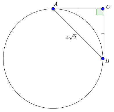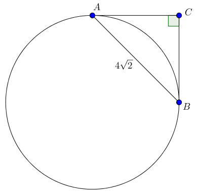 Касательные \(\displaystyle CA\) и \(\displaystyle CB\) образуют угол \(\displaystyle ACB \small,\) равный \(\displaystyle 90^\circ \small.\) Найдите длину отрезка \(\displaystyle AC\small ,\) если \(\displaystyle AB=4\sqrt{2}\small.\)
