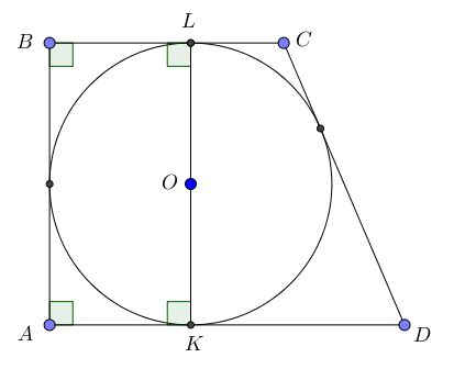 Пусть окружность касается оснований \(\displaystyle AD\) и \(\displaystyle BC\) в точках \(\displaystyle K\) и \(\displaystyle L\) соответственно.