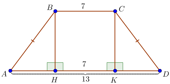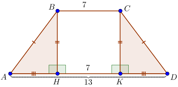 Прямоугольные треугольники \(\displaystyle ABH\) и \(\displaystyle DCK\) равны по гипотенузе \(\displaystyle AB=CD\) Значит, \(\displaystyle AH=DK\) и \(\displaystyle AH=DK=\frac{AD-BC}{2}=\) \(\displaystyle =\frac{13-7}{2}=\frac{6}{2}=3 \small.\) | ![]() |