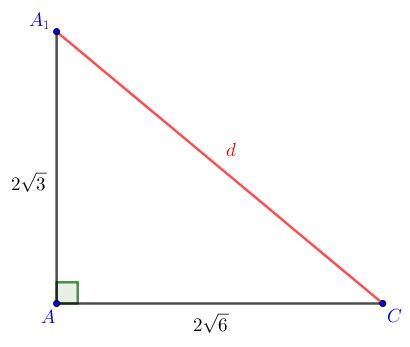 \(\displaystyle d^{\,2}=\left(2\sqrt3\right)^2+\left(2\sqrt6\right)^2{\small ,}\)