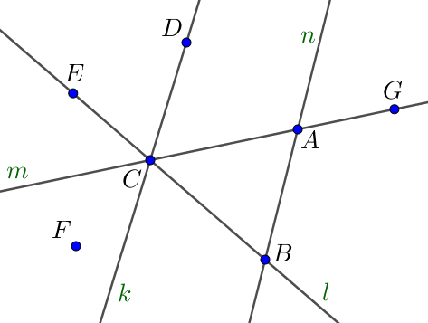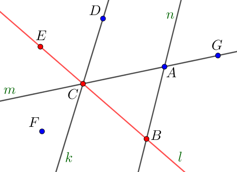 На прямой \(\displaystyle \color{green}{l}\) лежат точки \(\displaystyle E{\small,}\) \(\displaystyle C\) и \(\displaystyle B{\small.}\)