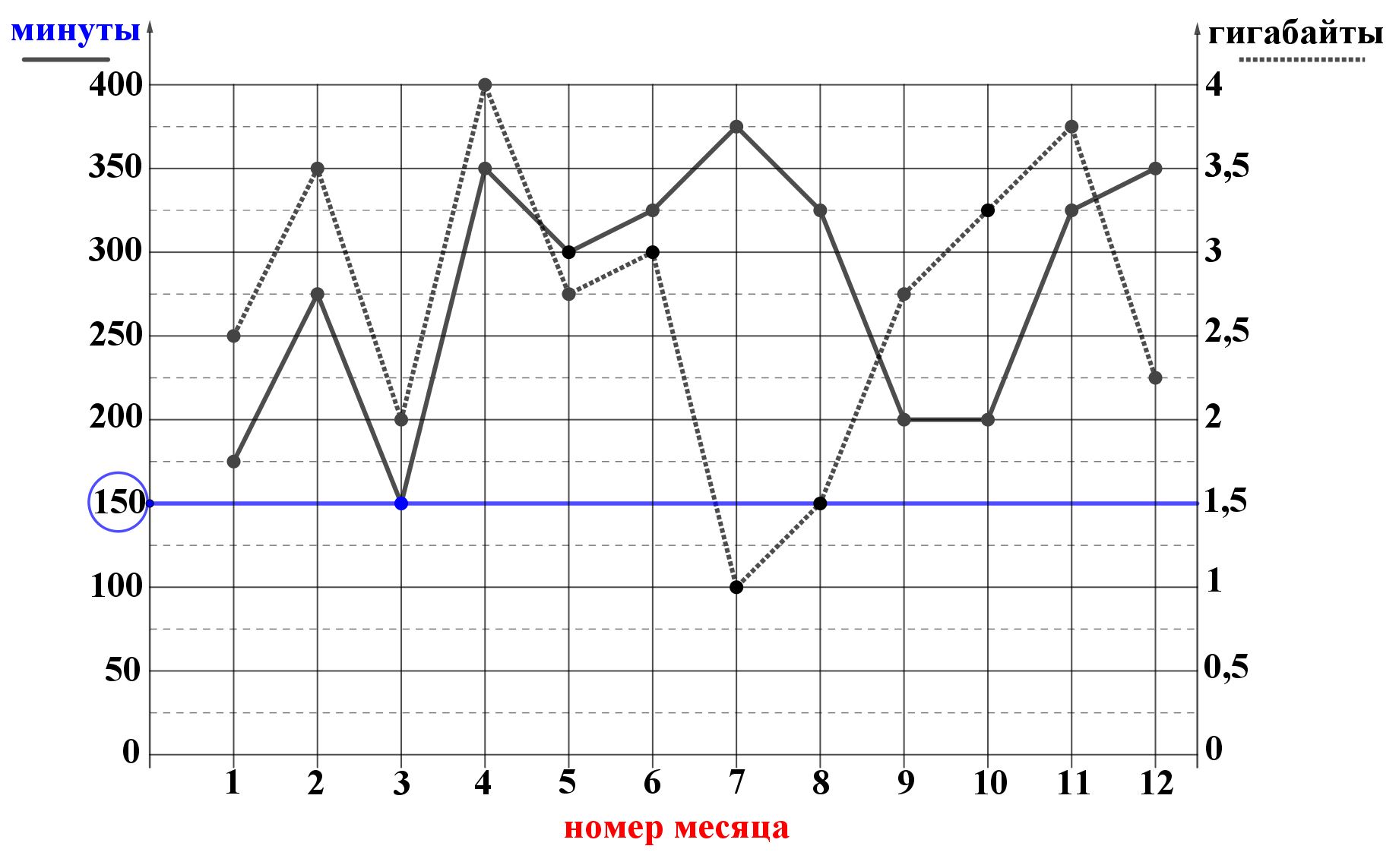 Месяцы, когда продолжительность исходящих вызовов составляла \(\displaystyle \color{blue}{150}\)минут, соответствуют вершинам сплошной ломаной, лежащим на этой прямой.
