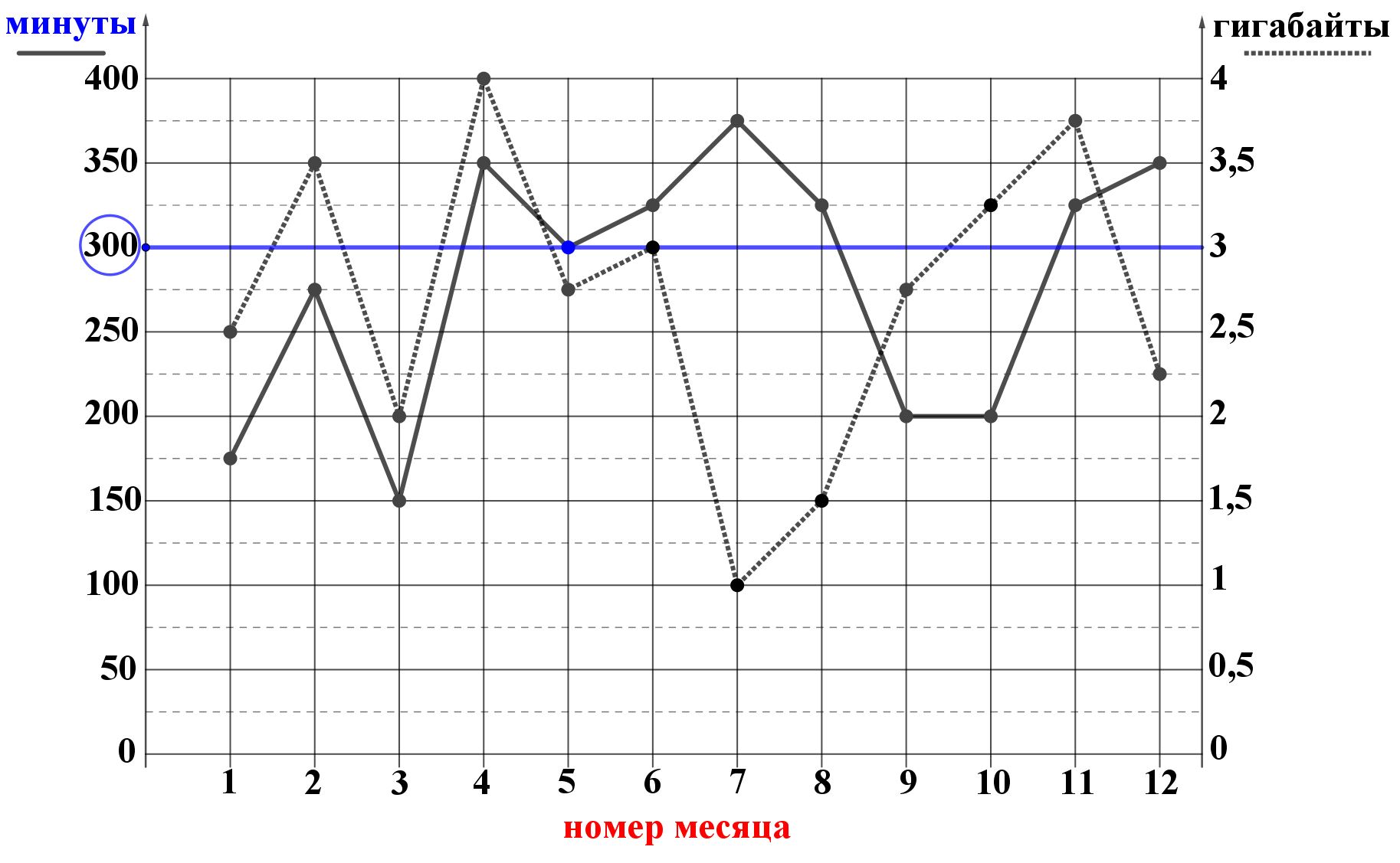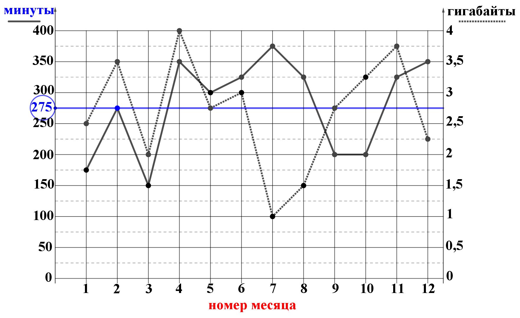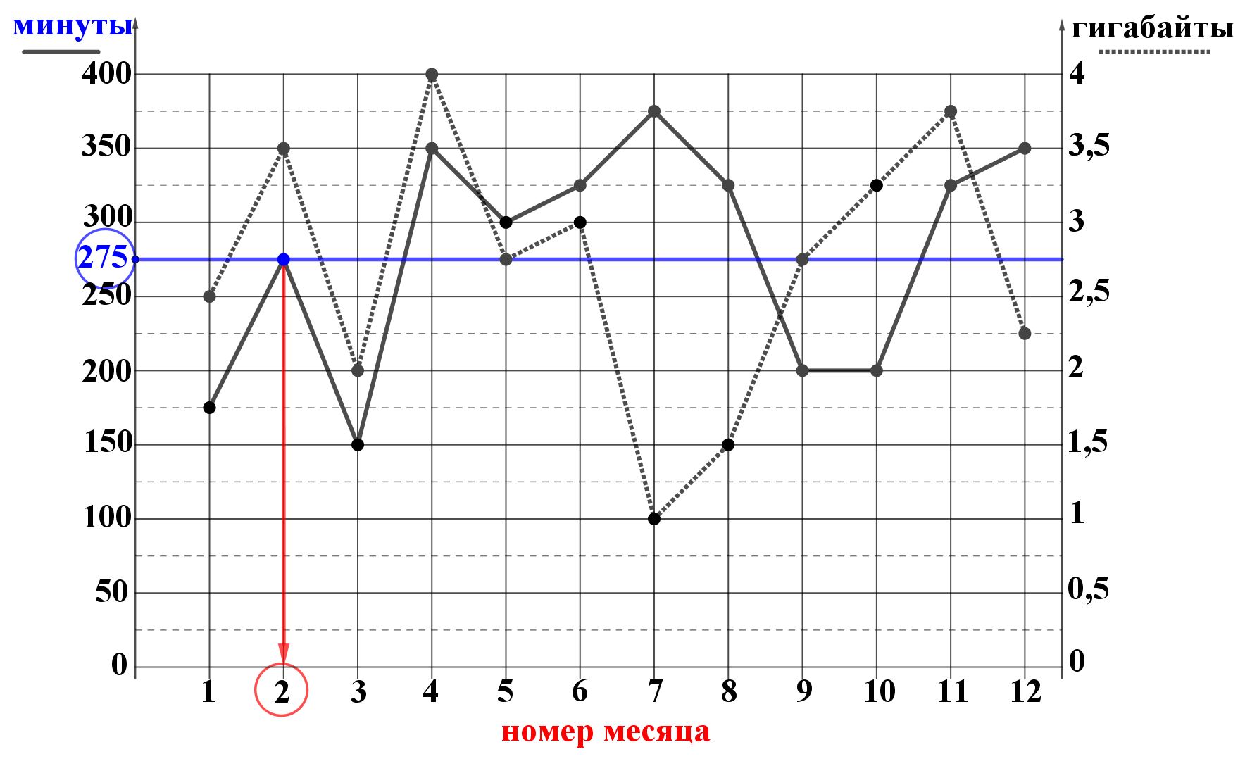 - точки, соответствующие количеству минут исходящих вызовов, соединены сплошной линией, поэтому при решении используем только сплошную ломаную.