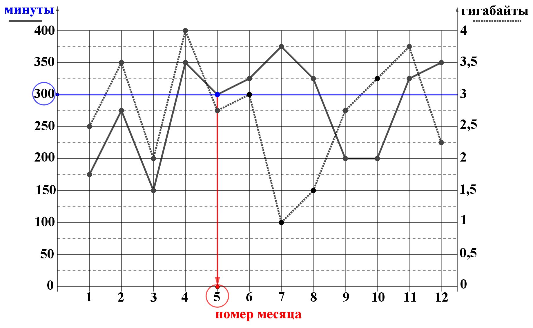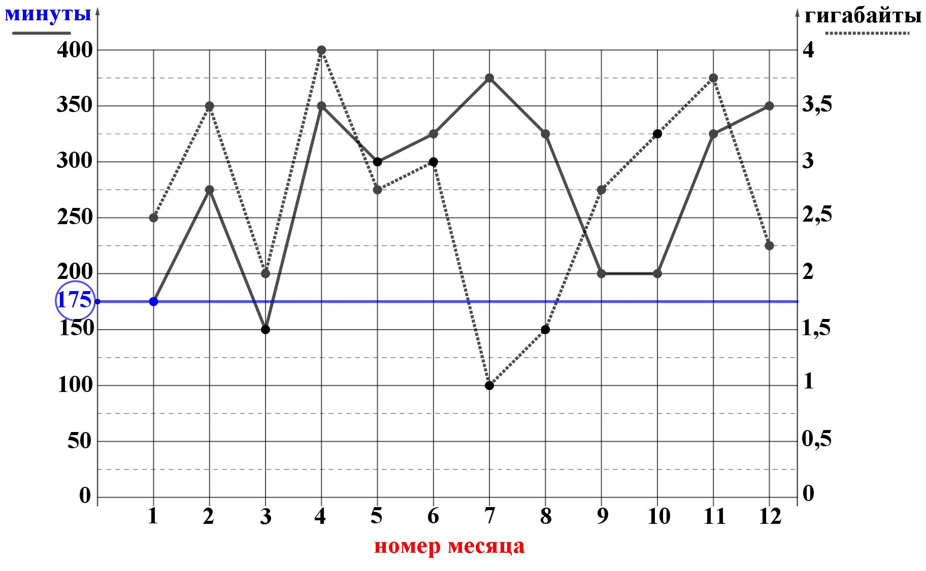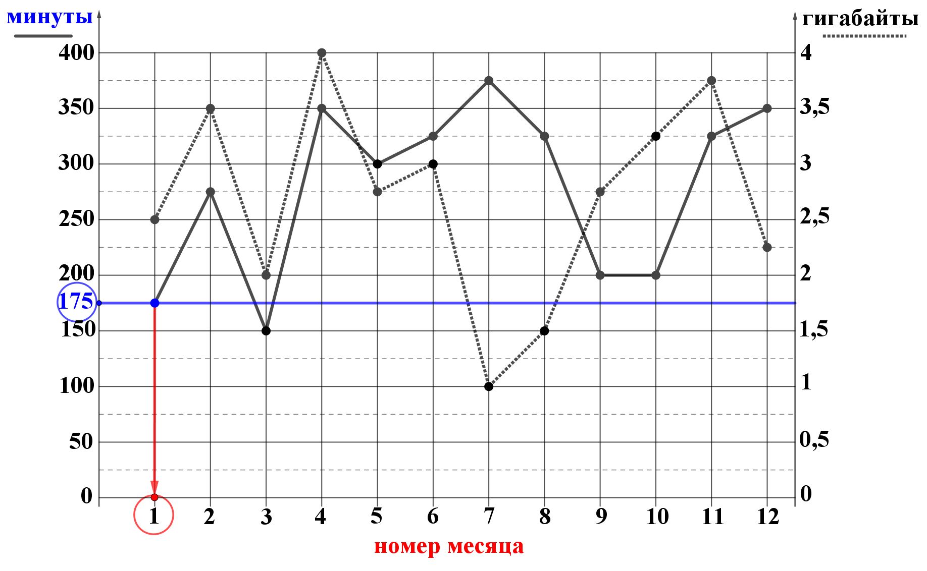 - точки, соответствующие количеству минут исходящих вызовов, соединены сплошной линией, поэтому при решении используем только сплошную ломаную.