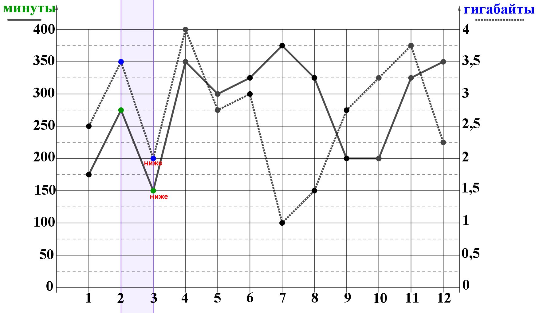 • на пунктирной ломаной вторая точка звена находится ниже первой – расход гигабайтов уменьшился.