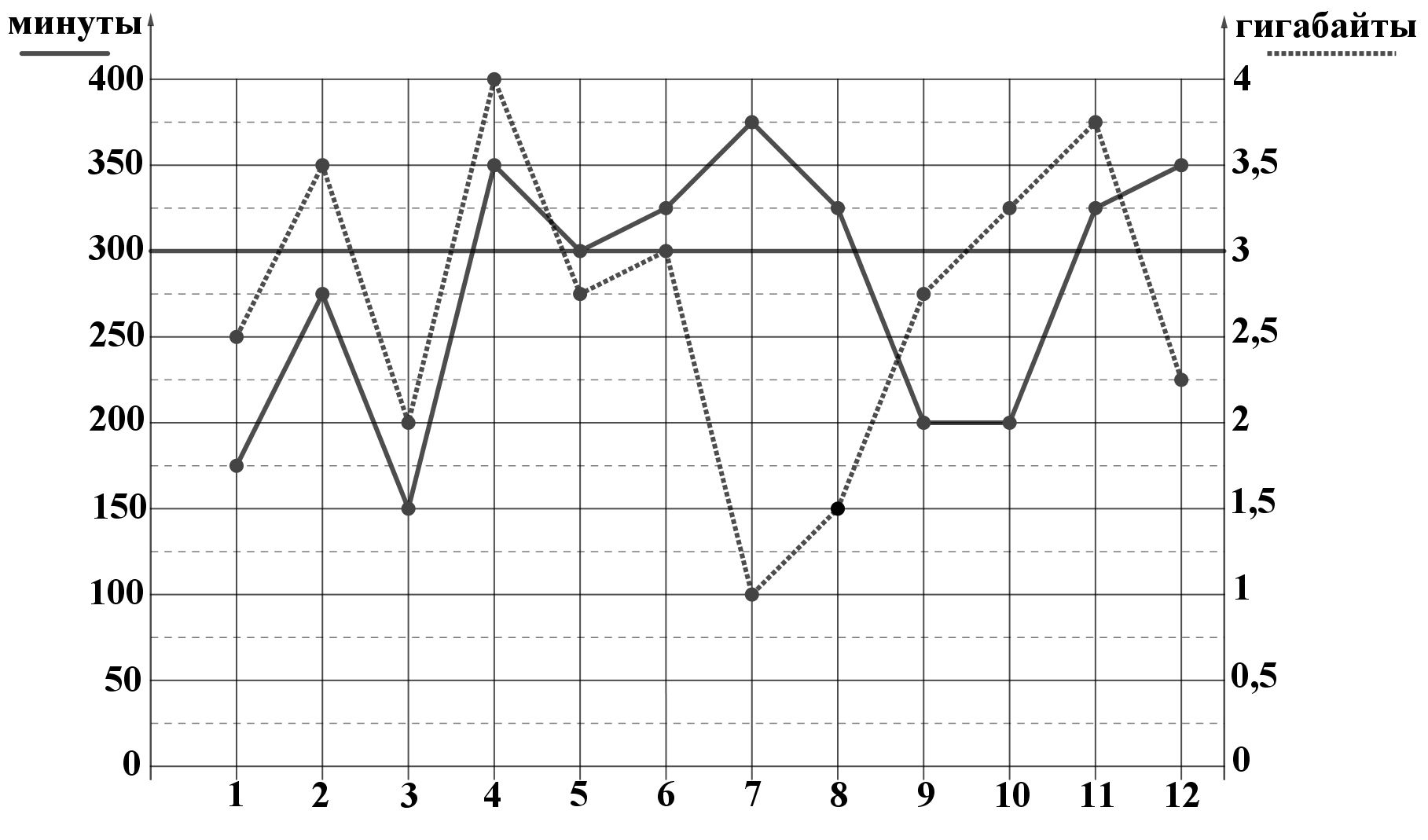 На рисунке точками показано количество минут исходящих вызовов и трафик мобильного интернета в гигабайтах, израсходованных абонентом в процессе пользования смартфоном, за каждый месяц \(\displaystyle 2019\) года. Для удобства точки, соответствующие минутам и гигабайтам, соединены сплошными и пунктирными линиями соответственно.