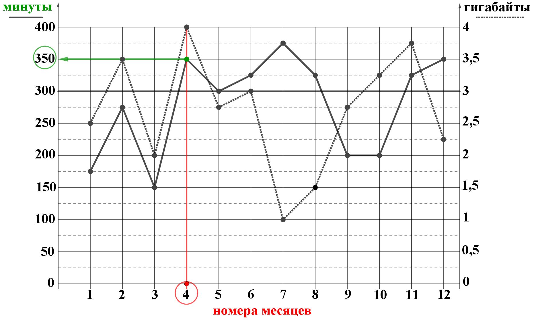 Количество минут исходящих вызовов, потраченных в апреле, соответствует вершинам сплошной ломаной, лежащим на этой прямой.
