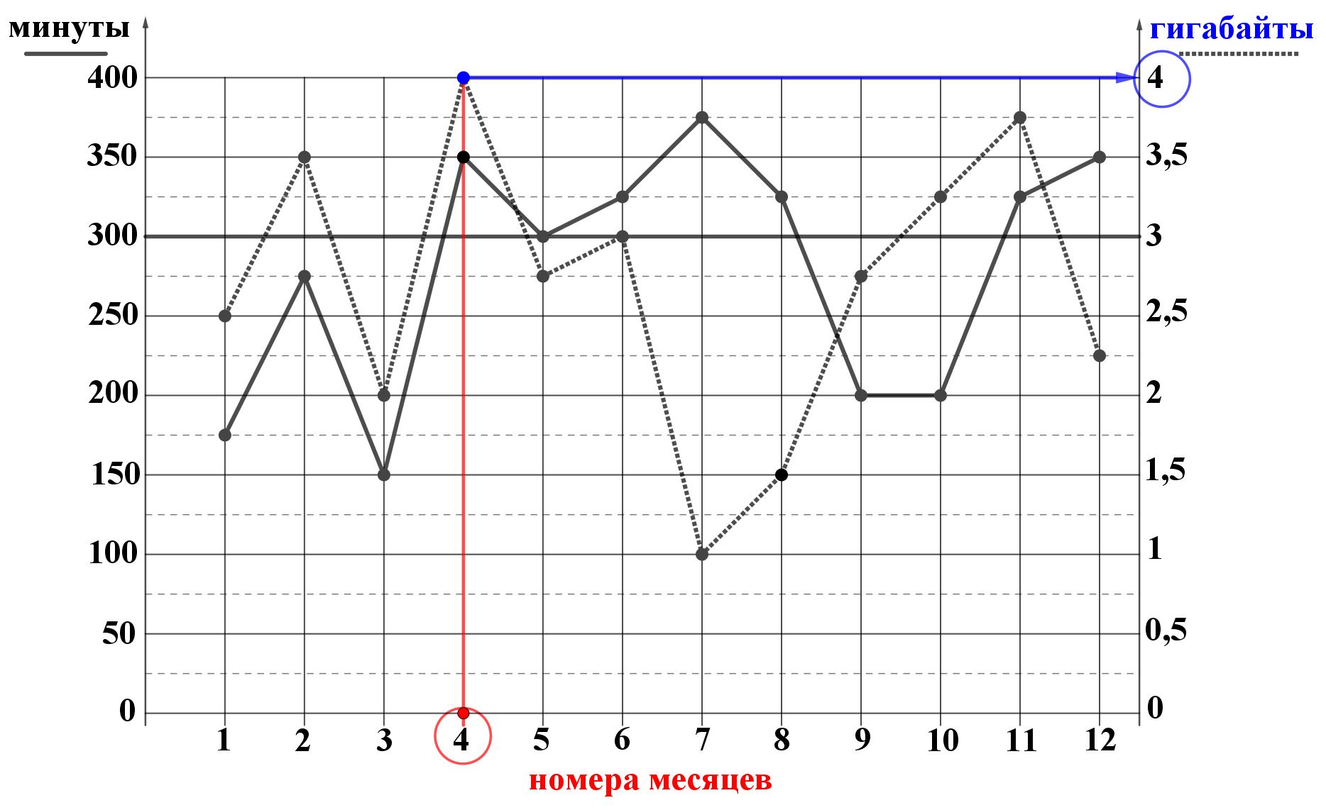 По условию задачи точки, соответствующие количеству минут исходящих вызовов, соединены сплошной линией, поэтому при решении используем только сплошную ломаную.