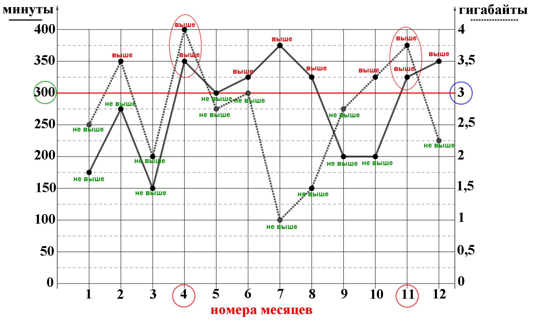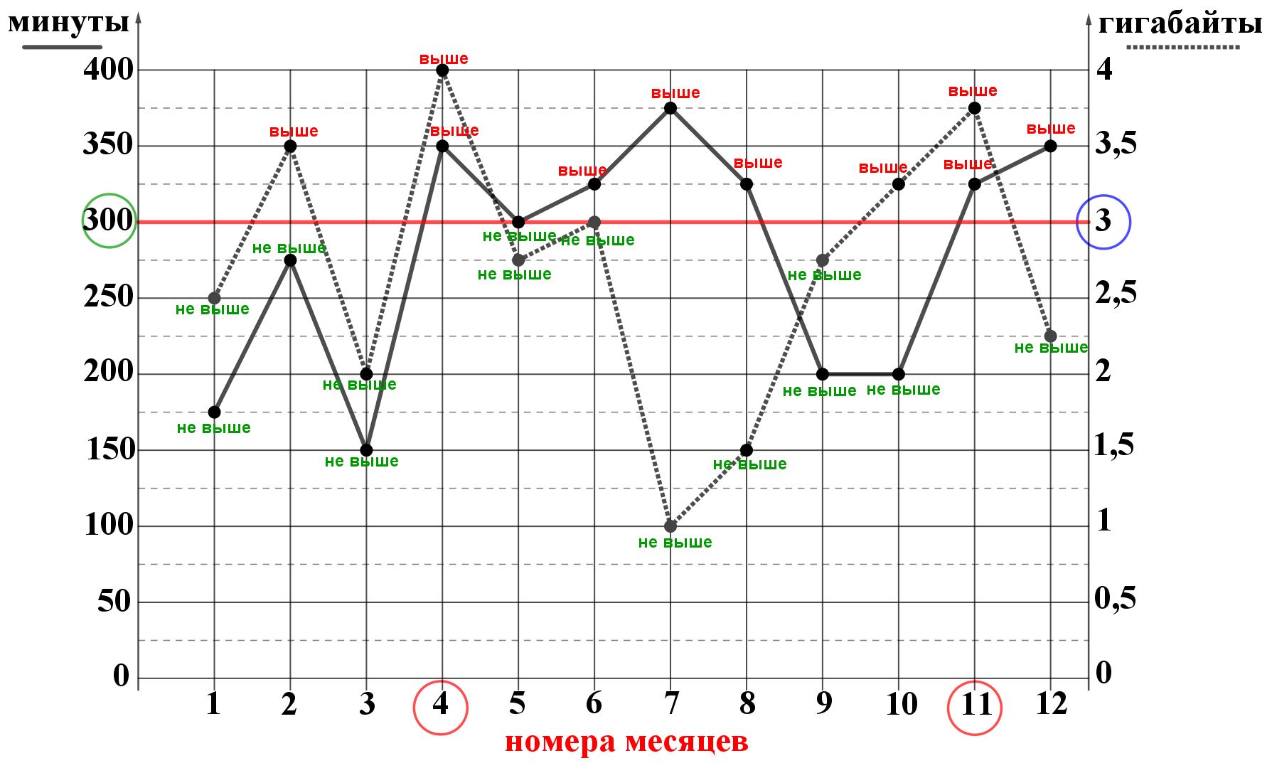 - месяцы, в которые абонент расходовал более \(\displaystyle 300\)минут, соответствуют вершинам сплошной ломаной, лежащим выше проведенной горизонтальной прямой;