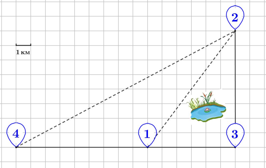 По условию длина стороны клетки равна \(\displaystyle 1\)км. Поэтому расстояние в \(\displaystyle 23\)клетки соответствует \(\displaystyle 23\)км.