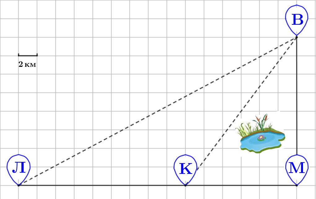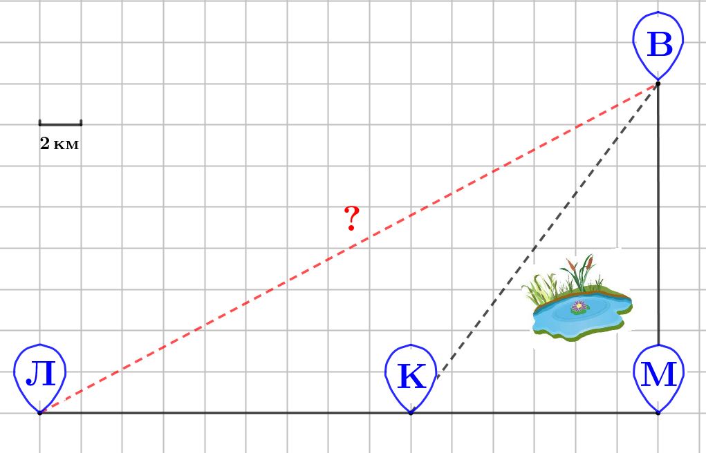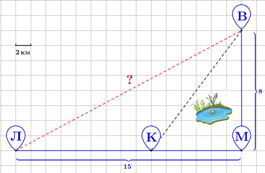 Таким образом, требуется найти длину отрезка \(\displaystyle \mathbf {ЛВ}\) в километрах.
