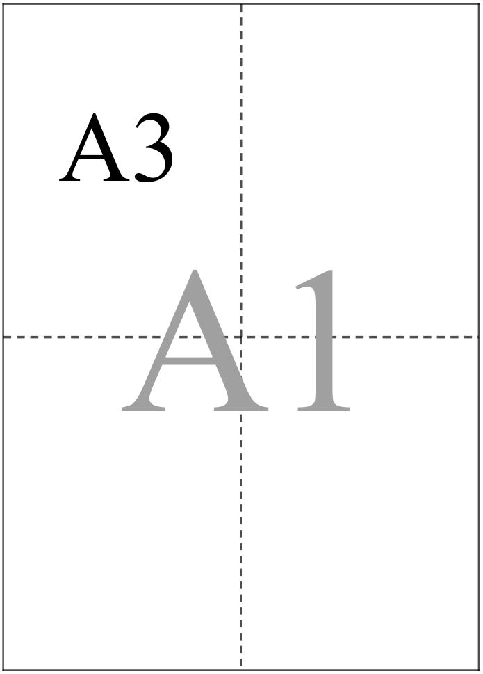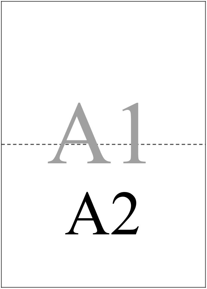 То есть из одного листа формата \(\displaystyle А1\) получится \(\displaystyle 2\) листа формата \(\displaystyle А2{\small,}\) а из каждого листа формата \(\displaystyle А2\) получится по \(\displaystyle 2\) листа формата \(\displaystyle А3{\small.}\)